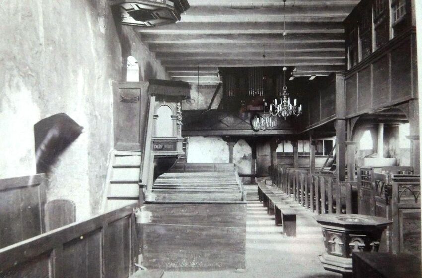 Die gezeigte Skizze aus dem Jahre 1908 zeigt das neue Kirchenschiff mit einem separaten an der Westseite gelegenen alten Turm. Im Kirchenschiff erkennen wir unsere Kirche wieder, die drei ...
