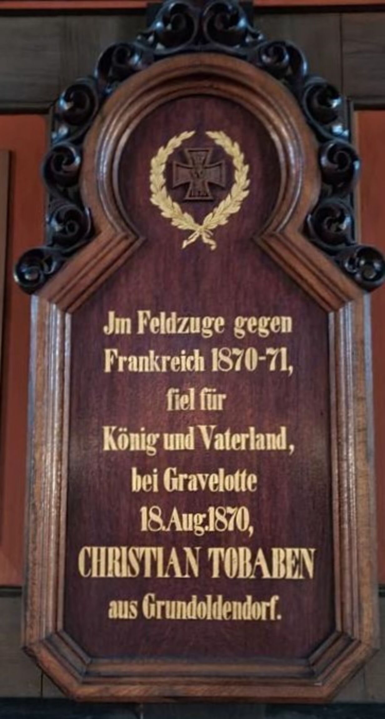 Mit der Tafel wird an Christian Tobaben aus Grundoldendorf gedacht, gefallen im Feldzug gegen Frankreich 1870-71.