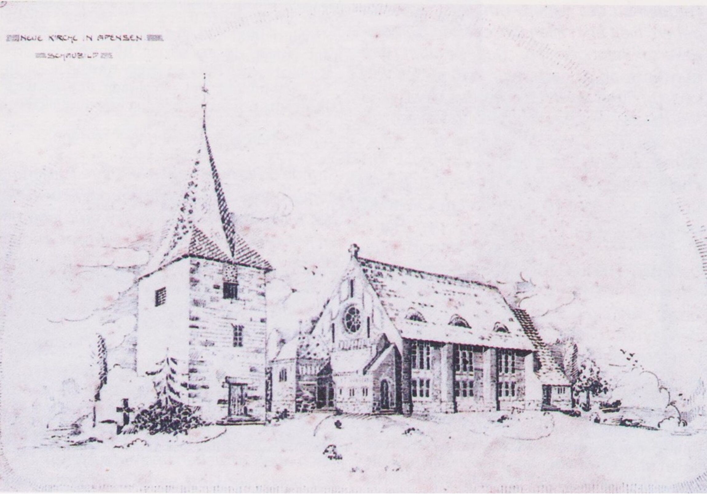 Die gezeigte Skizze aus dem Jahre 1908 zeigt das neue Kirchenschiff mit einem separaten an der Westseite gelegenen alten Turm.